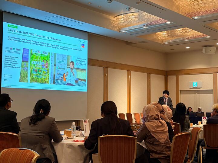 フェイガー東南アジア事業統括の坂本が登壇し、フィリピンで進めるAWD(間断かんがい技術)を活用した稲作分野のメタン排出削減 の取り組みについて、導入プロセス、現地行政・研究機関・日本企業との連携、JCM(二国間クレジット)制度を活用した事業構築の進捗を報告しました。